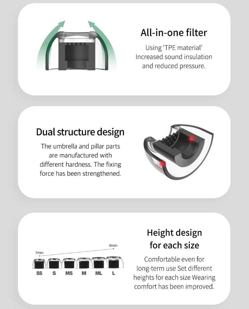 Мы продумали все, чтобы обеспечить ваш комфорт, включая расчет высоты для каждого размера, что делает амбушюры SednaEarfit XELASTEC Ⅱ идеальными для длительного ношения без дискомфорта.