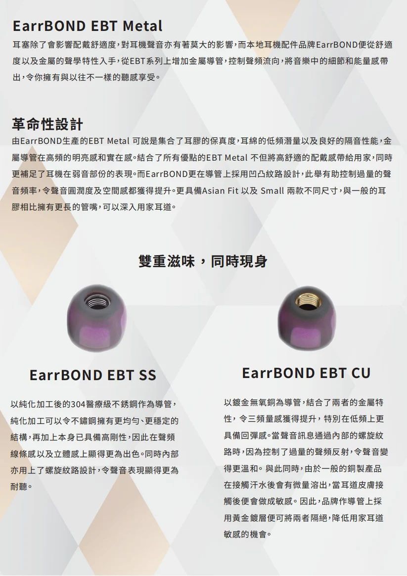 Новые металлические трубчатые вкладыши EarrBOND звучат интригующе! Конструкция биметаллической трубочки «медь со стальной оболочкой» — это продуманный подход. Частичное покрытие поверхности нержавеющей стали бескислородной медью позволяет сохранить уникальные звуковые характеристики обоих металлов.