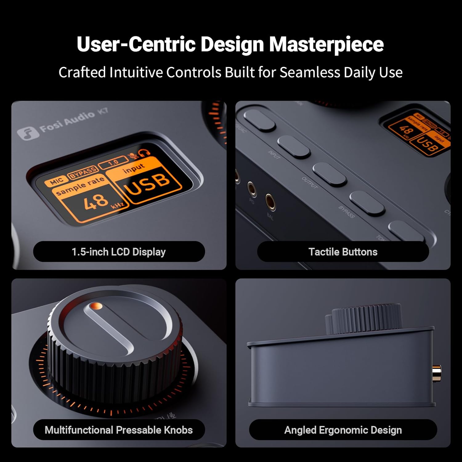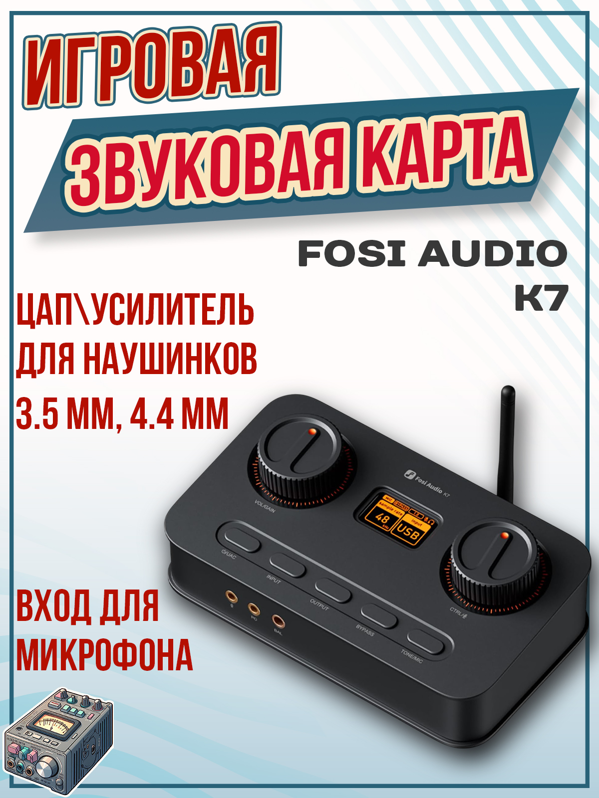 Fosi Audio K7 - это настольный ЦАП (цифро-аналоговый преобразователь) и усилитель для наушников, предназначенный для улучшения качества звука, как для геймеров, так и для аудиофилов. Он сочетает в себе функциональность и удобство использования, предлагая как цифровые, так и аналоговые входы, а также выход на наушники.