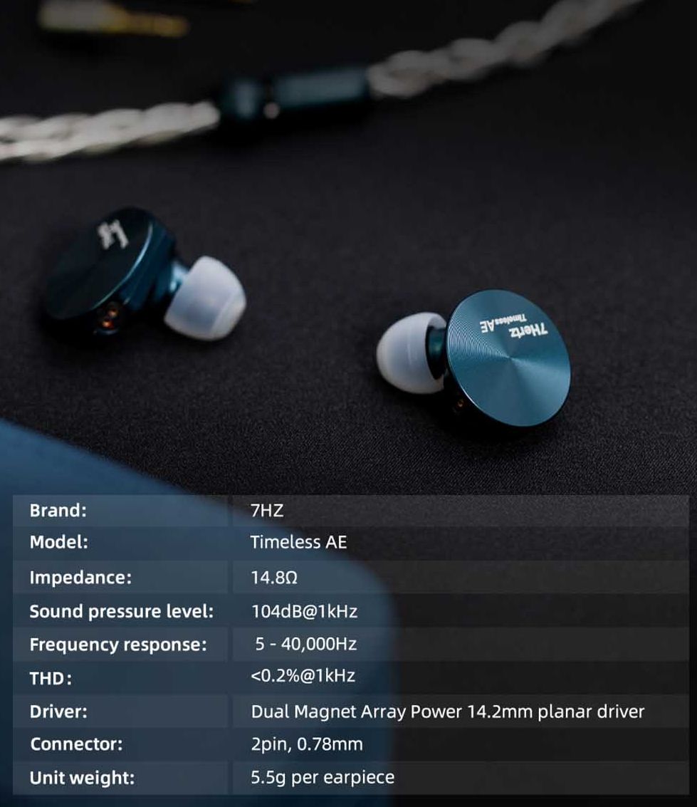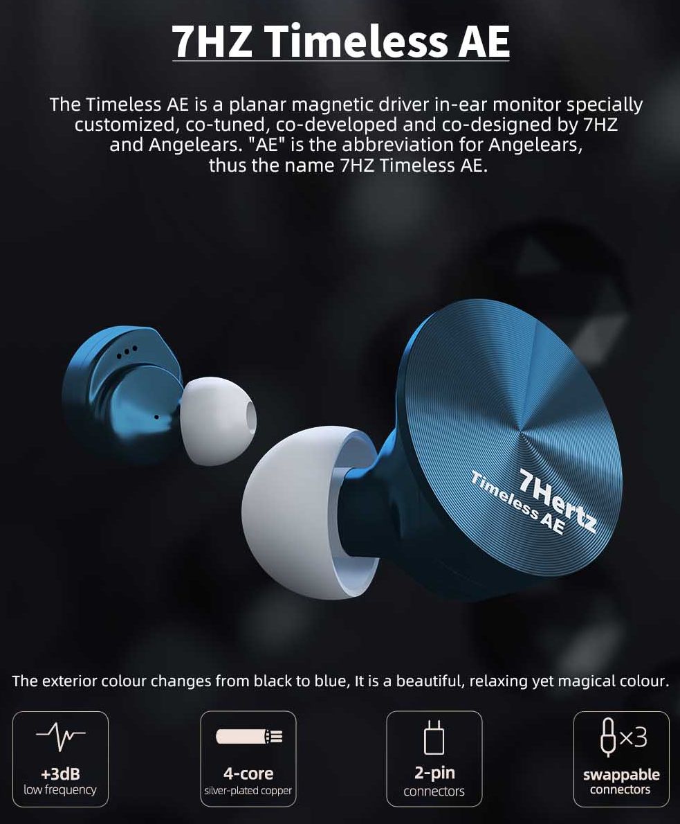 7Hz Timeless AE - это совершенно новая специальная пара IEM с планарным магнитным драйвером, разработанная в сотрудничестве с AngelEars. Буква "AE" в названии означает AngelEars. Она получила новую цветовую схему, новый модернизированный модульный кабель и новый профиль настройки по сравнению с OG Timeless. С Timeless AE вас ждет отличное времяпрепровождение, поскольку эта пара обеспечивает мощный низ, чистые средние и четкие высокие частоты.