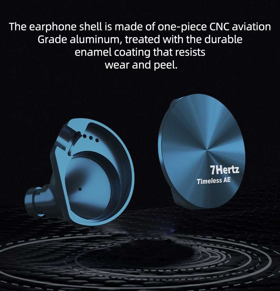 Timeless AE оснащены высококачественными ушными раковинами из алюминиевого сплава, обработанного на станках с ЧПУ. Цвет Timeless AE также был изменен с черного (OG Timeless) на новый насыщенный синий цвет. Раковины изготовлены из высококачественного авиационного алюминия. 7Hz также обработала каждую раковину эмалевым покрытием для большей долговечности.