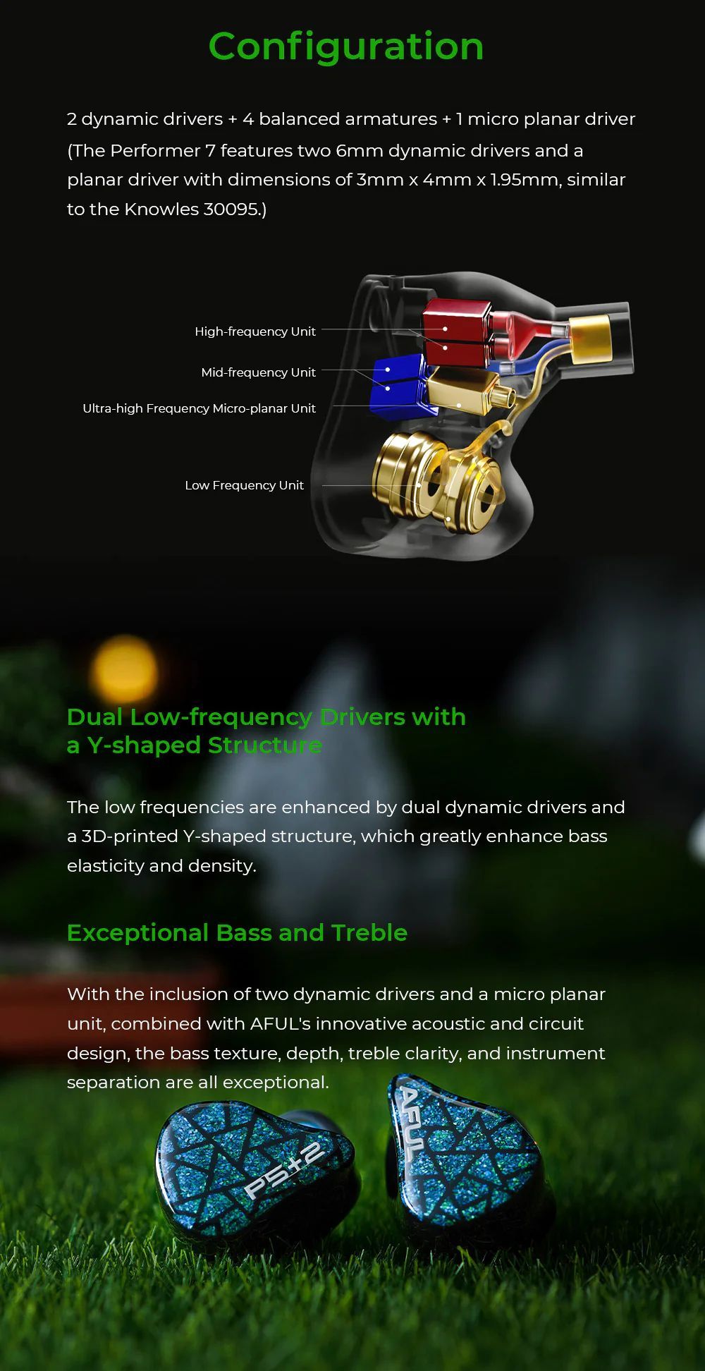 Бас: Два 6-мм динамических драйвера, работающих в уникальной Y-образной конструкции, создают упругий и глубокий бас. Система балансировки давления дополнительно улучшает текстуру низких частот и снижает нагрузку на барабанные перепонки.