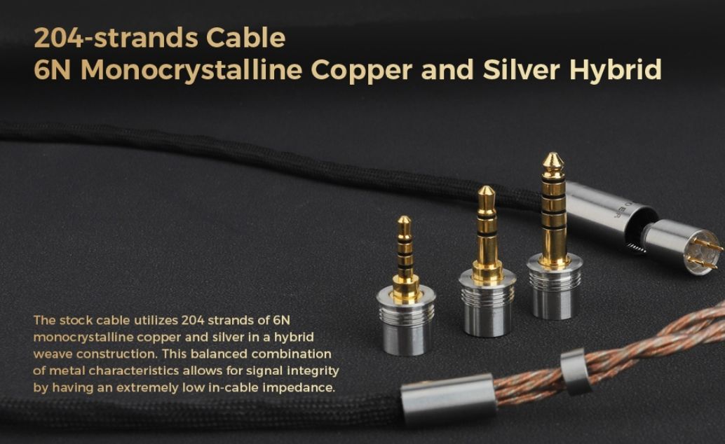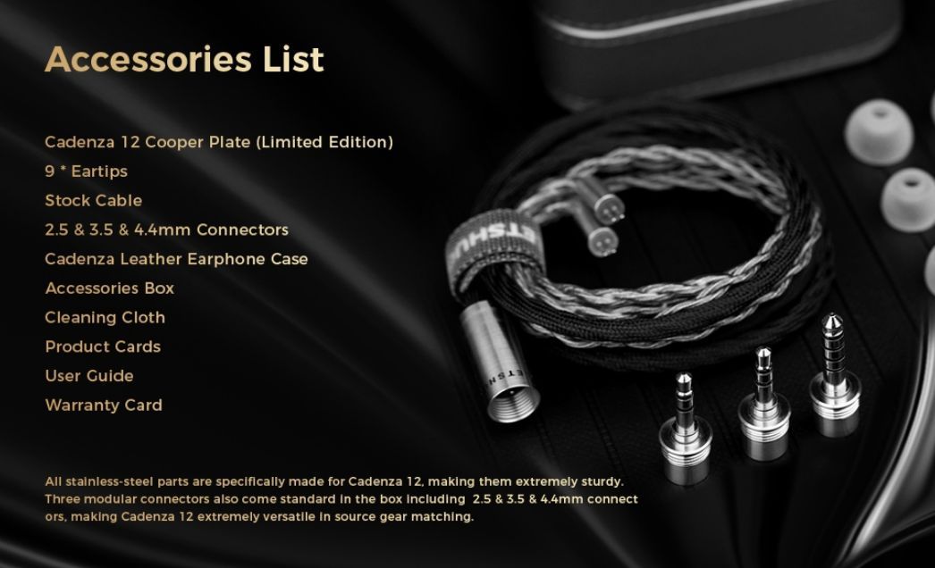 Cadenza 12 поставляется в комплекте с высокочистым стоковым кабелем. Пара включает в себя гибридный кабель из монокристаллической меди и монокристаллического серебра. В этом кабеле используется модульная система оконечных штекеров, позволяющая пользователю легко переключаться между 3,5 м, 2,5 мм и 4,4 мм оконечными штекерами.
