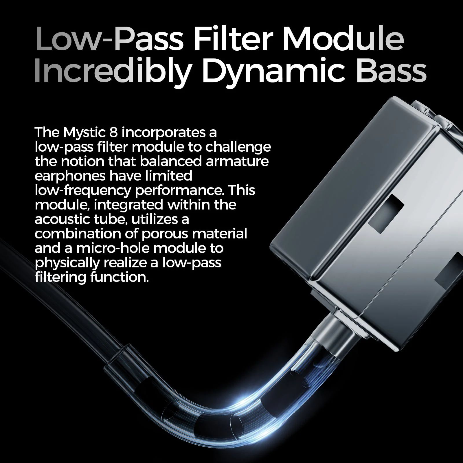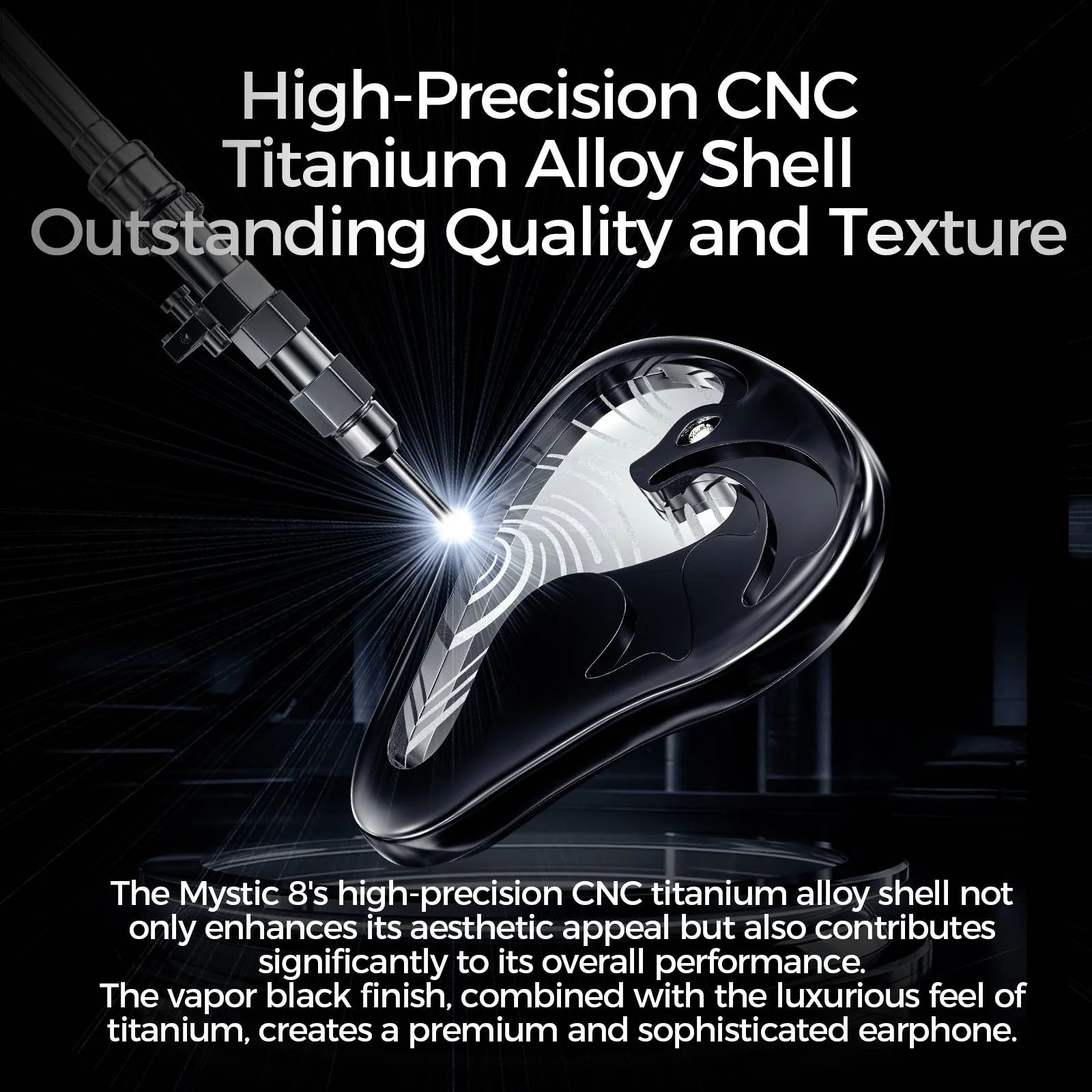 Корпус Mystic 8 изготовлен из титаново-алюминиевого сплава, обработанного методом прецизионной механической обработки (CNC), что делает наушники прочными, устойчивыми к коррозии и удобными для длительного ношения. Черное напыление придает модели стильный вид, а свойства титана снижают гармонические искажения, улучшая качество звука.