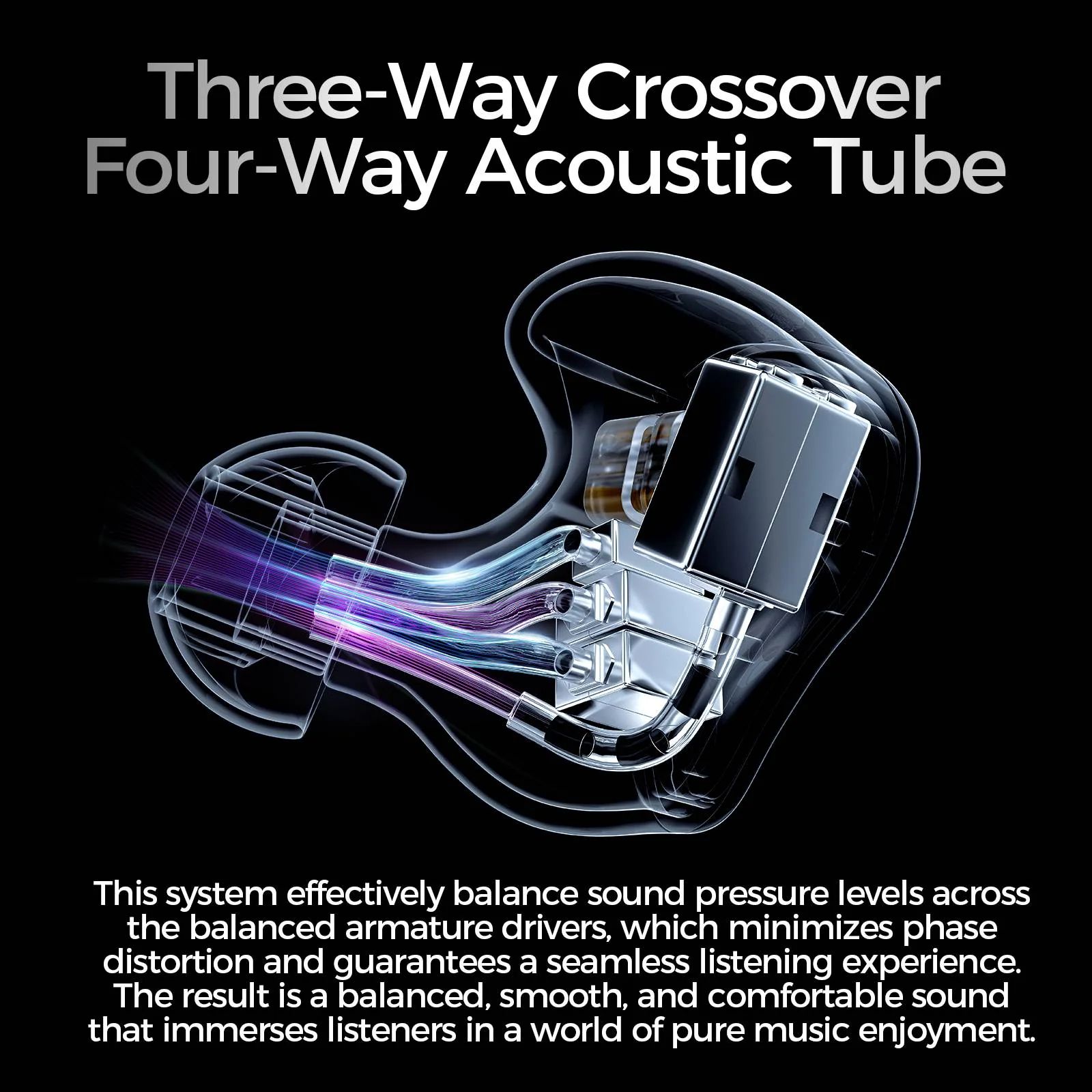 Особенностью конструкции является низкочастотный фильтр, который усиливает басовый отклик без перегрузки и размытия звукового баланса. Дополнительно применена трёхполосная электронная кроссоверная схема и четырёхканальная акустическая трубка, что минимизирует фазовые искажения и обеспечивает плавный переход между частотами.