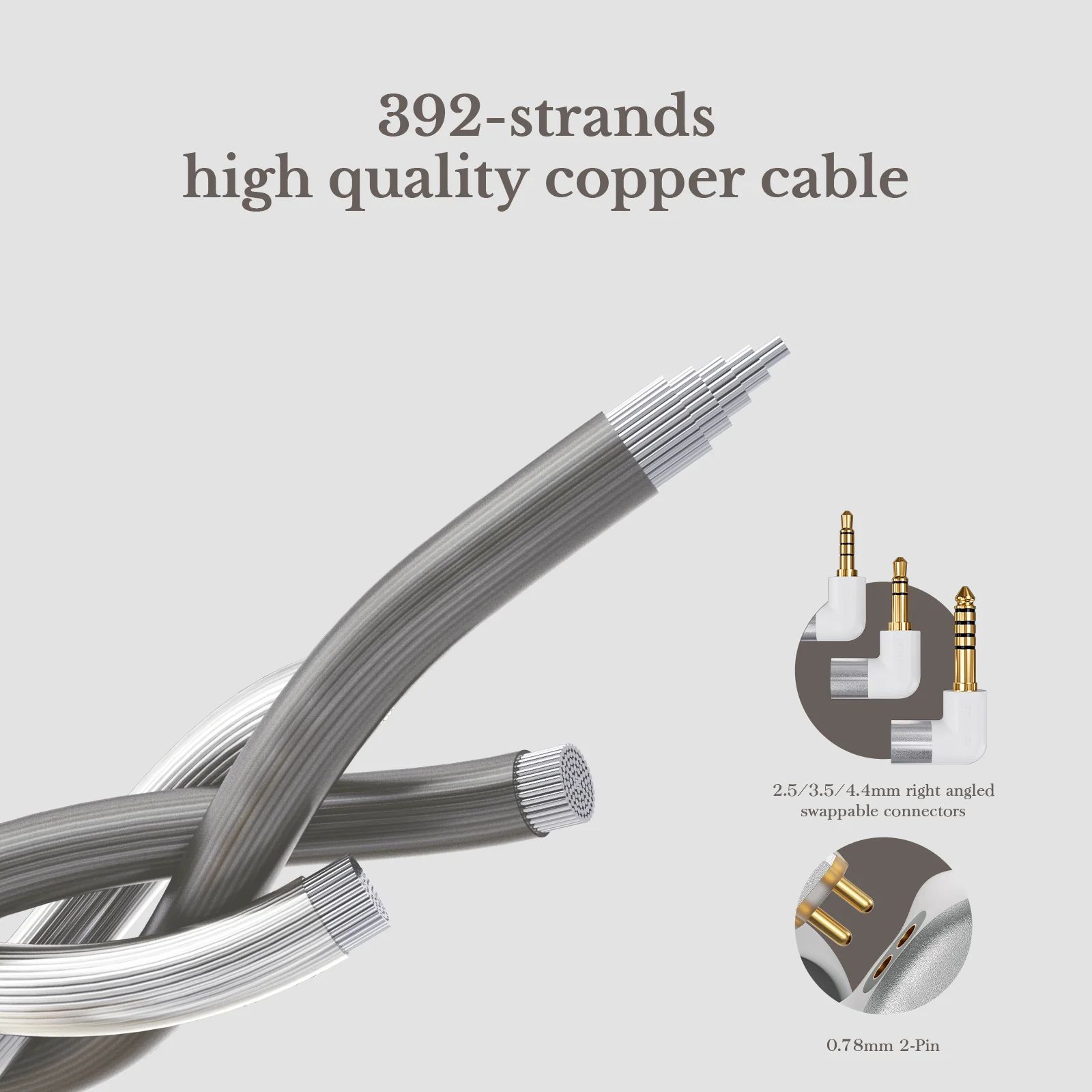 Комплектный кабель – восьмижильный, изготовленный из серебряно-покрытой монокристаллической меди. В каждой жиле 20 ультратонких проводников, а внутренняя армировка из кевларового волокна 200D повышает надежность и защищает от механических повреждений. Разъем – двухконтактный 0,78 мм, что делает наушники совместимыми с различными кабелями и источниками.