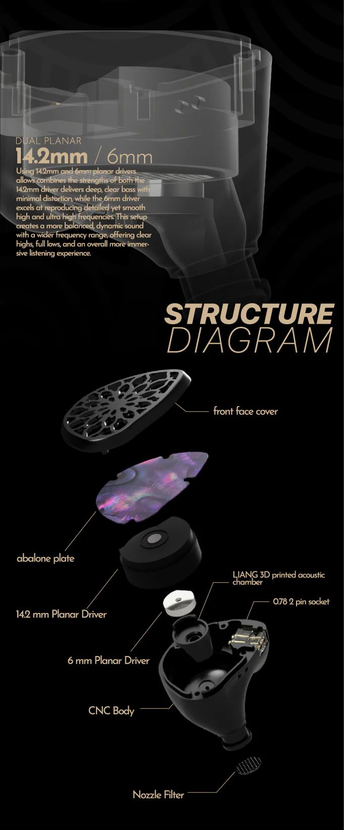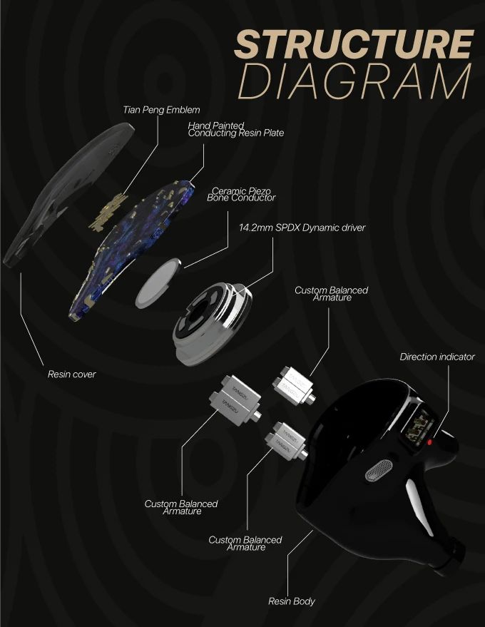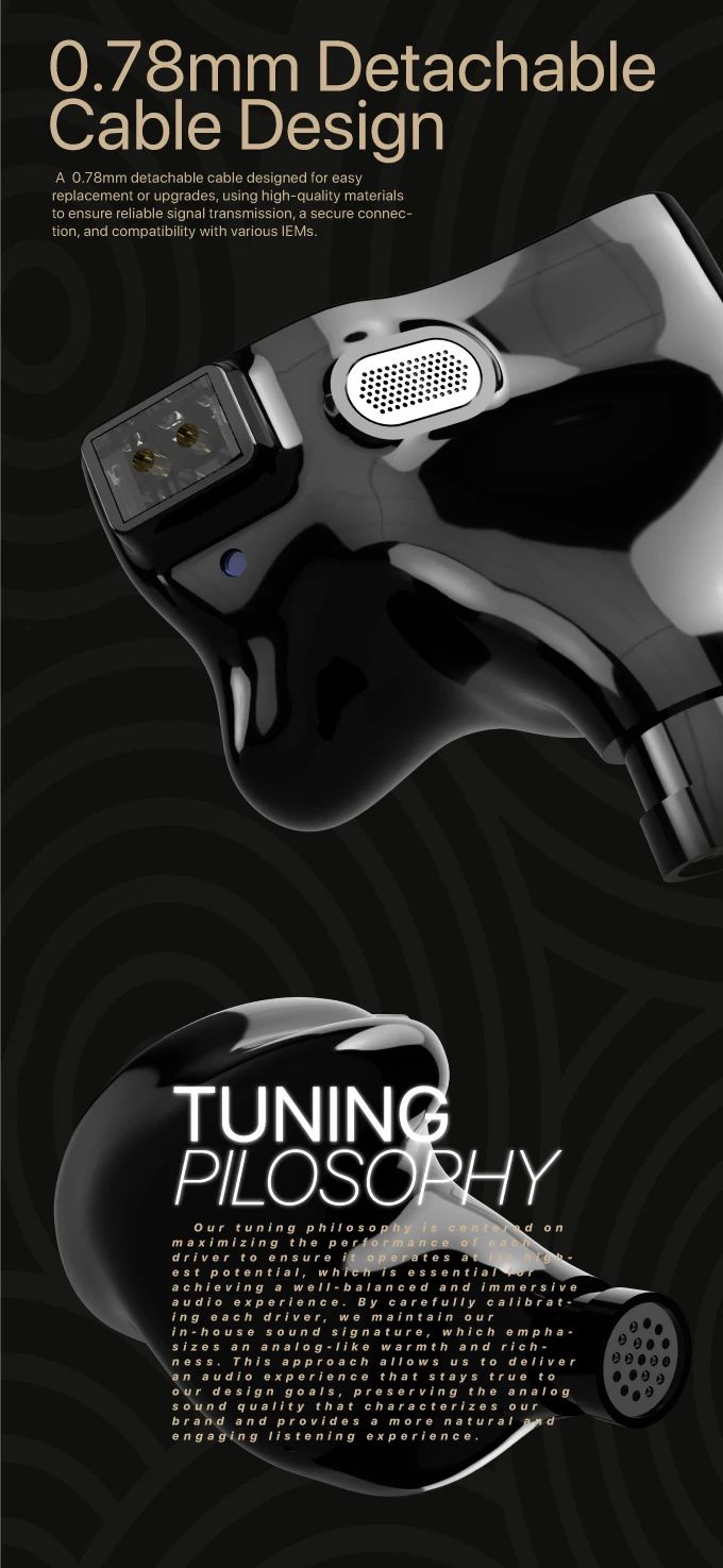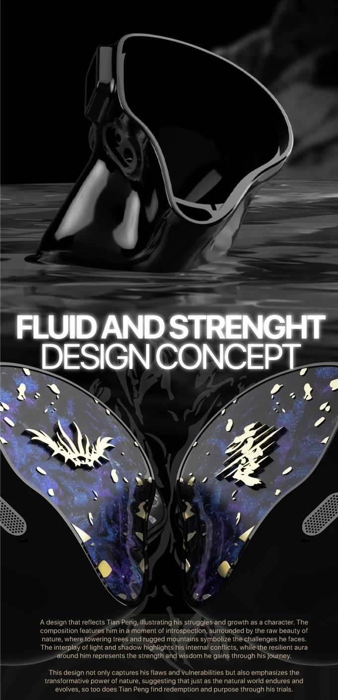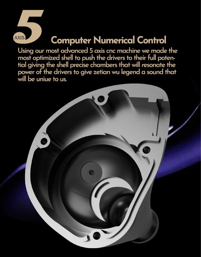 Корпус наушников выполнен с использованием прецизионной обработки 5-осевым станком с ЧПУ, что позволило достичь идеальной формы акустических камер. Такой подход усиливает производительность драйверов и придаёт звучанию уникальный характер. Эстетика модели вдохновлена фиолетовым лотосом – символом чистоты и глубины, а также легендарной императрицей У Цзэтянь, олицетворяющей мудрость и амбиции. Этот дизайн объединяет утончённость и силу в одной форме.