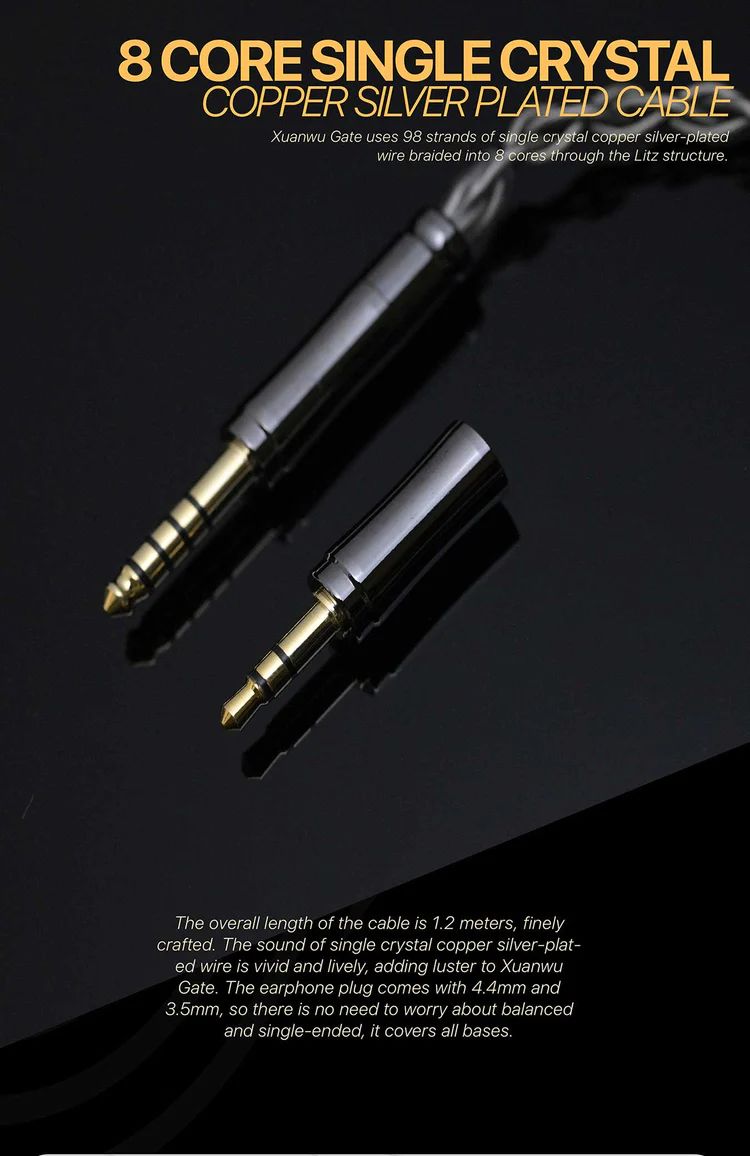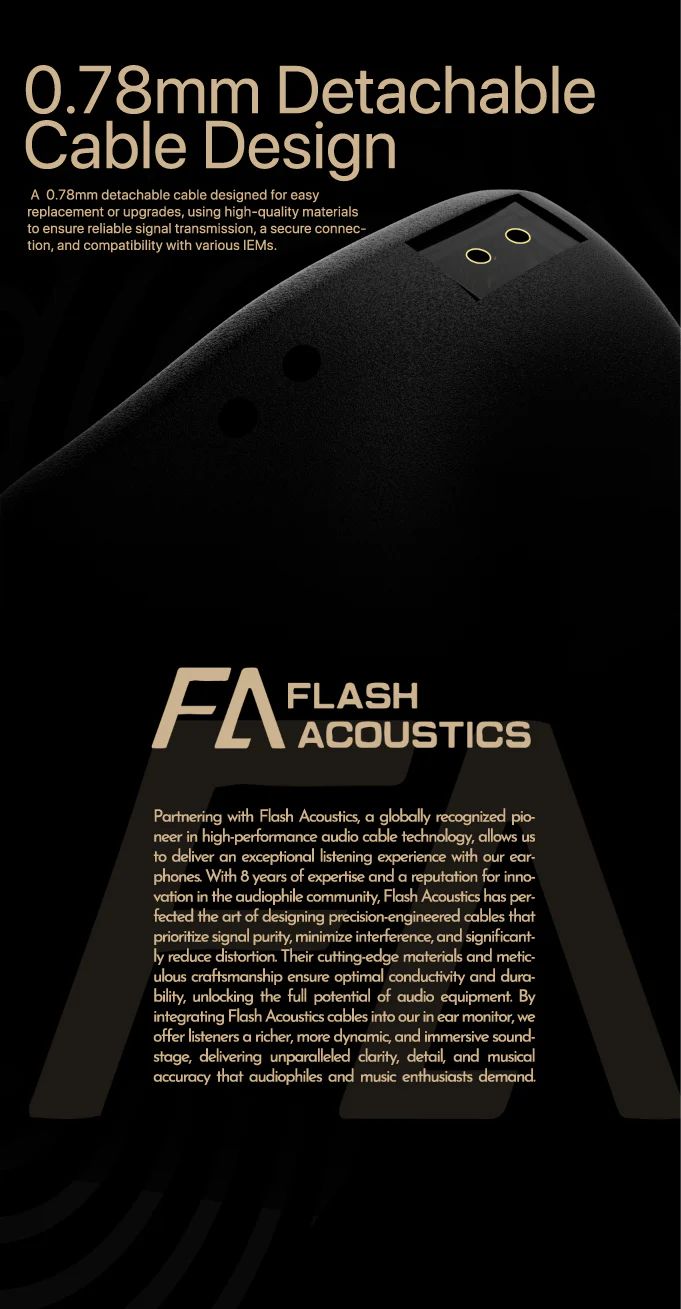 Наушники оснащены высококачественным кабелем, созданным в сотрудничестве с Flash Acoustics. Используются проводники из бескислородной меди с высоким уровнем очистки (5N LCOFC), что минимизирует искажения и обеспечивает точную передачу сигнала. Съёмный разъём формата 0,78 мм позволяет легко менять кабель или обновлять его при необходимости, обеспечивая надёжное подключение и совместимость с другими устройствами.
