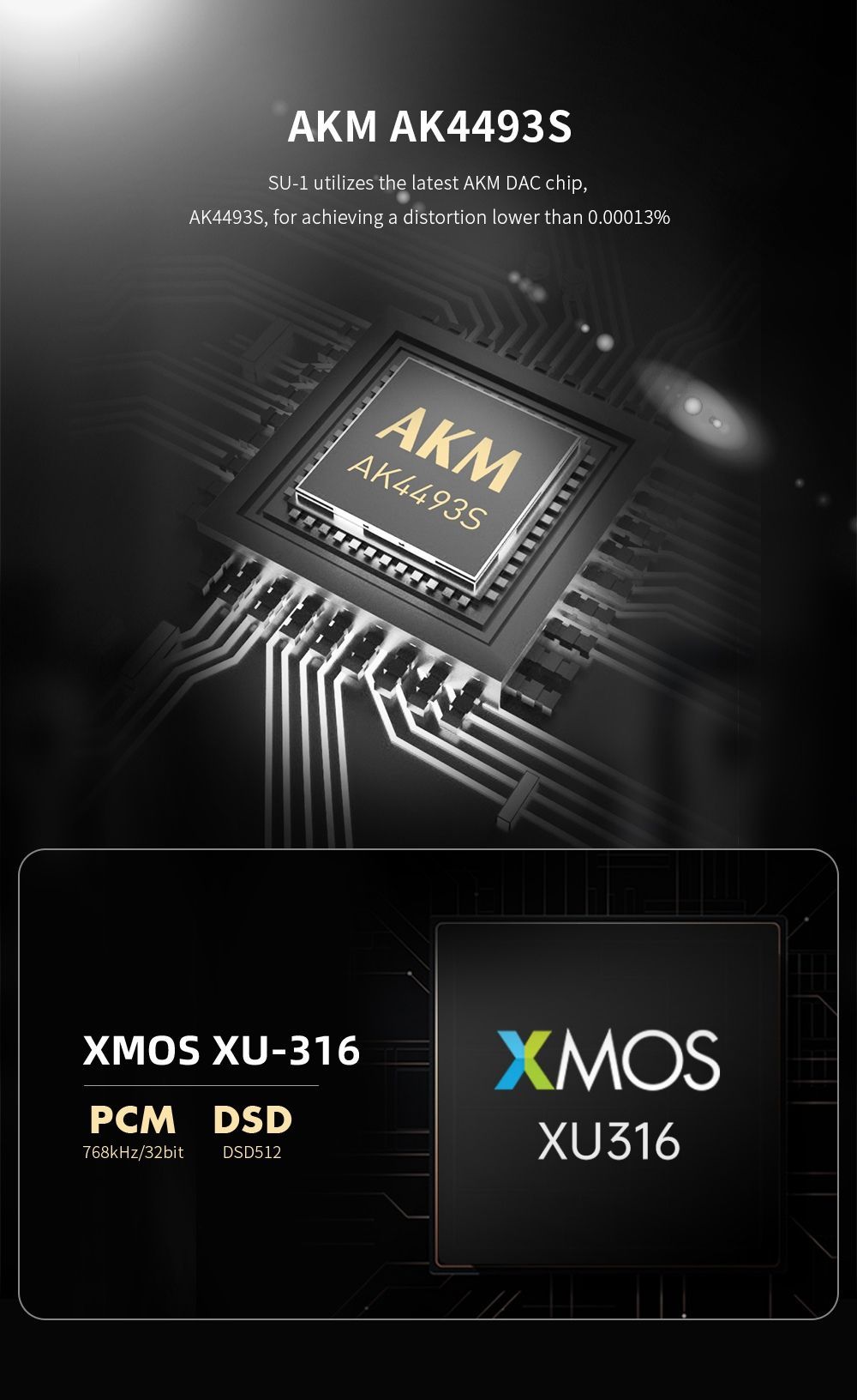 Вход USB-C SU-1 сочетается с мощным интерфейсом XMOS XU316, эффективно обрабатывающим полученный аудиосигнал. В сочетании с ЦАП AK4493S это позволяет SMSL SU-1 поддерживать аудиопотоки высокого разрешения вплоть до PCM 32bit 768 кГц и DSD512.