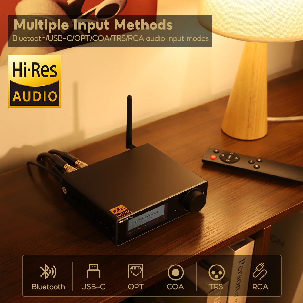 Aiyima A80 - новый интегральный усилитель класса D, сочетающий компактность и широкие функциональные возможности. Он оснащен высококачественным ЦАП-чипом ESS9038Q2M и усилителем TPA3255D2, что позволяет обрабатывать звук с разрешением до PCM 32 бит/384 кГц и DSD256. При стандартном блоке питания 48В 5А устройство выдает до 2x120 Вт на нагрузку 4 Ом. Беспроводное подключение обеспечивается Bluetooth 5.1 с поддержкой кодеков AAC, SBC, aptX, aptX LL и aptX HD, что делает связь стабильной и удобной.