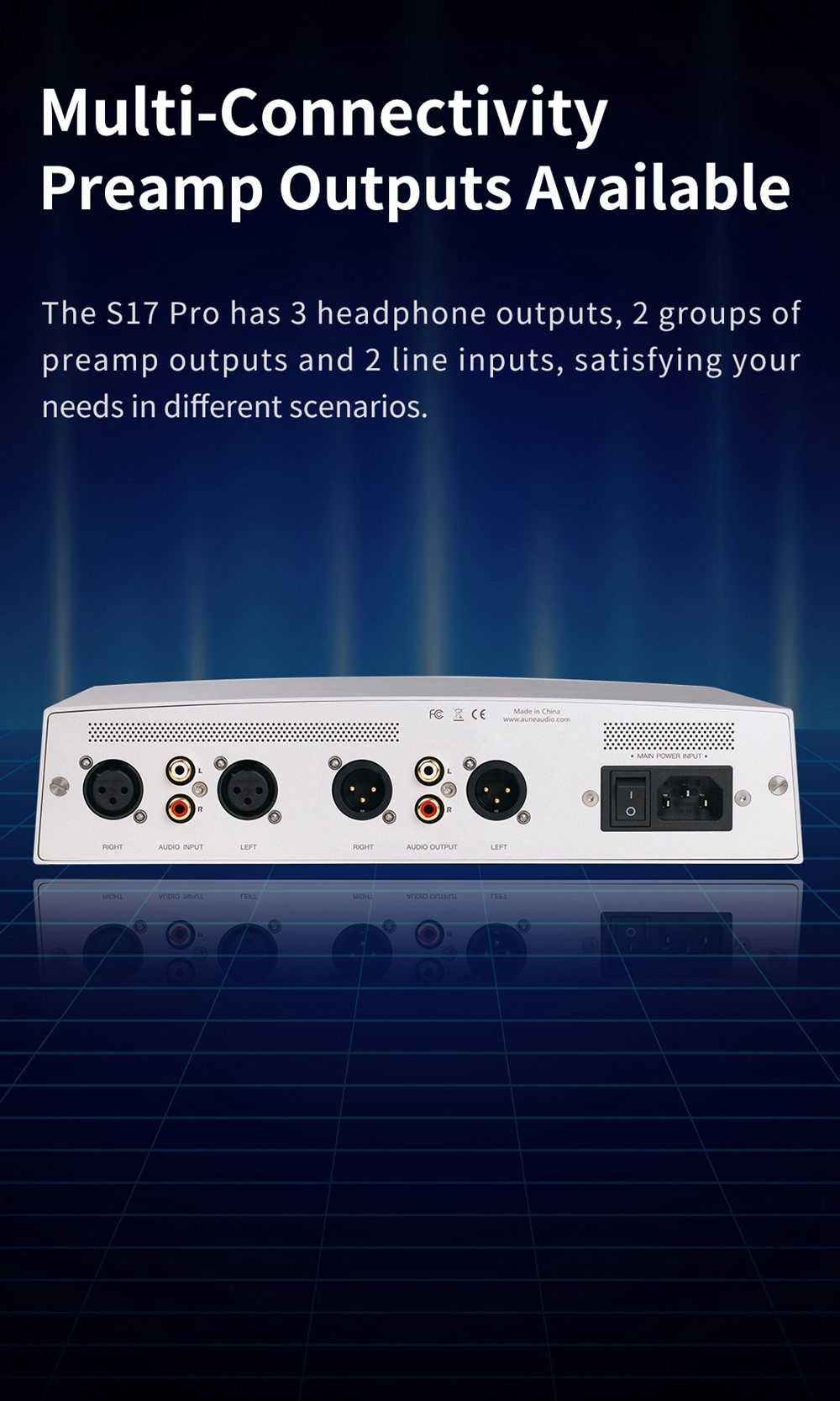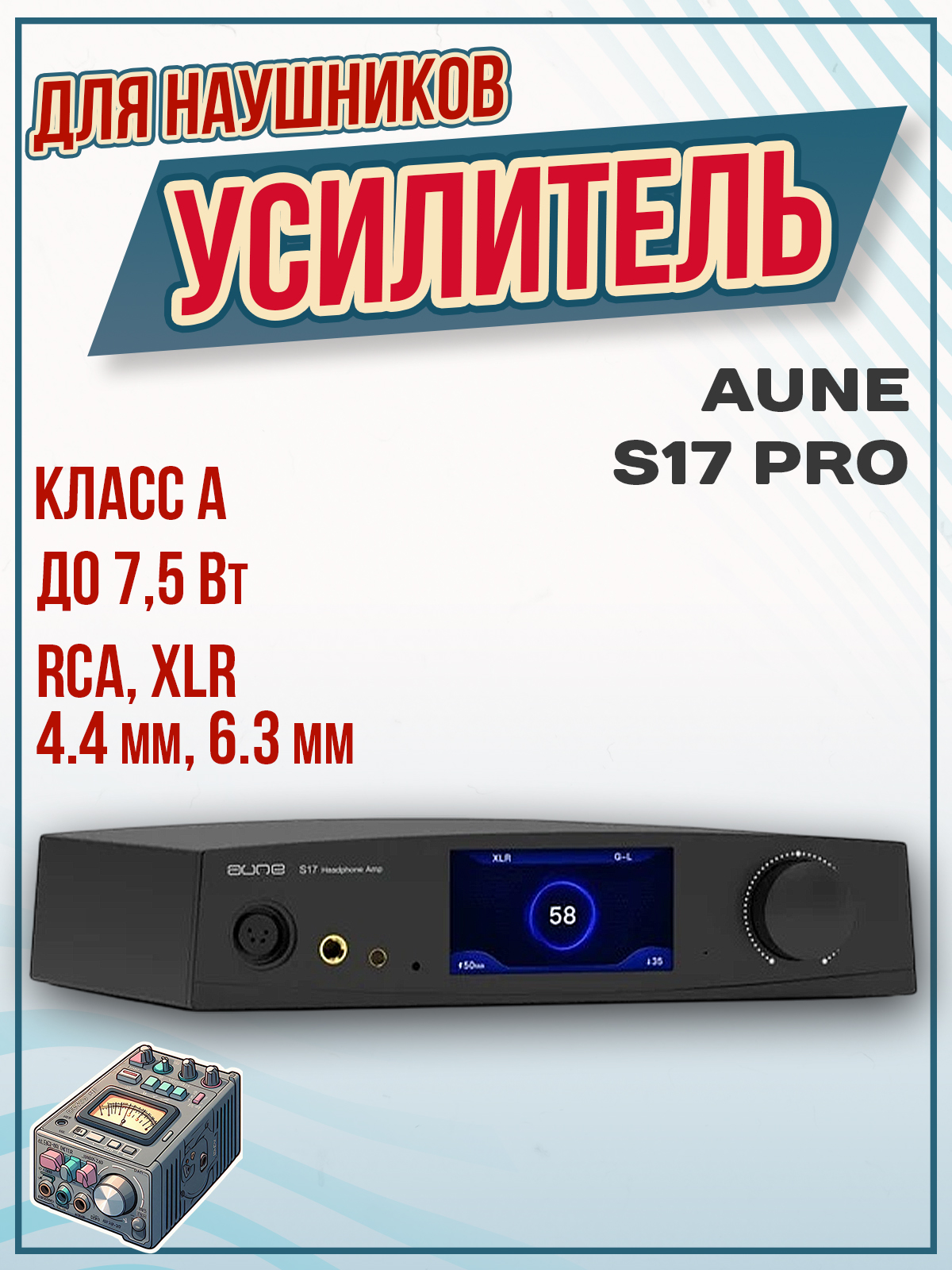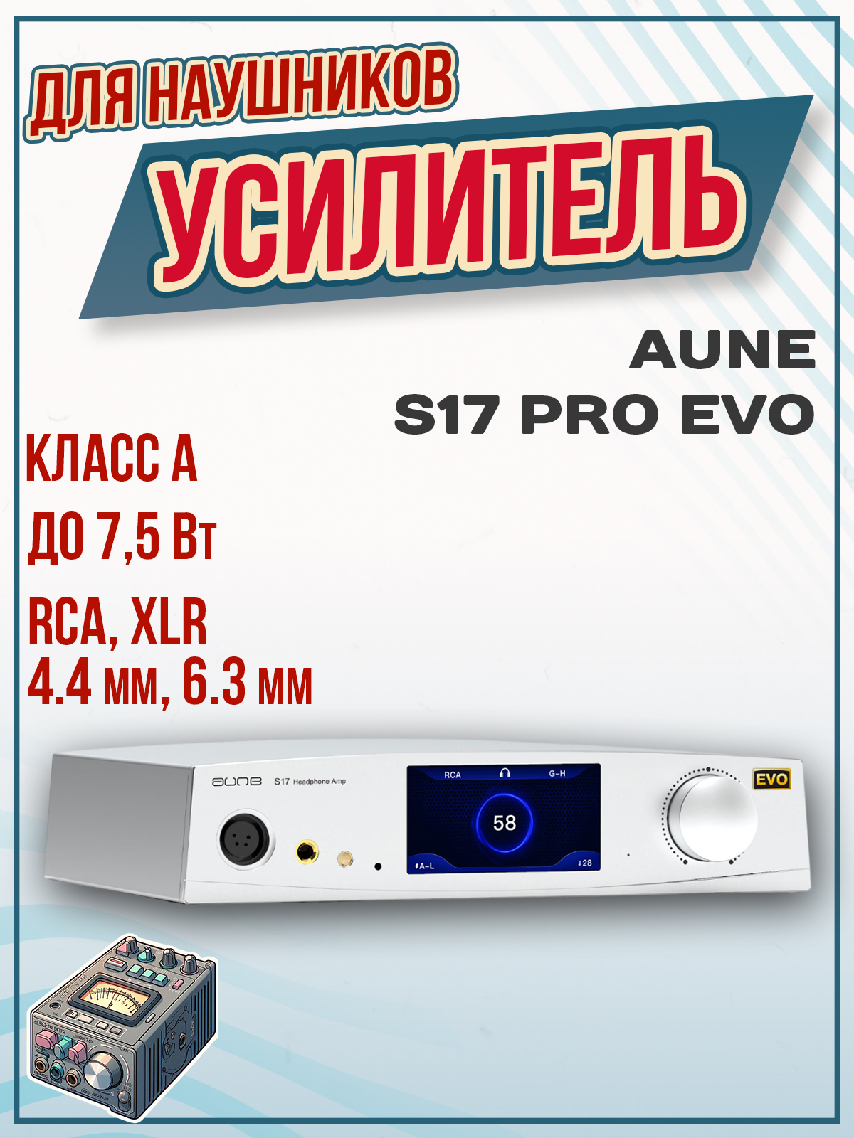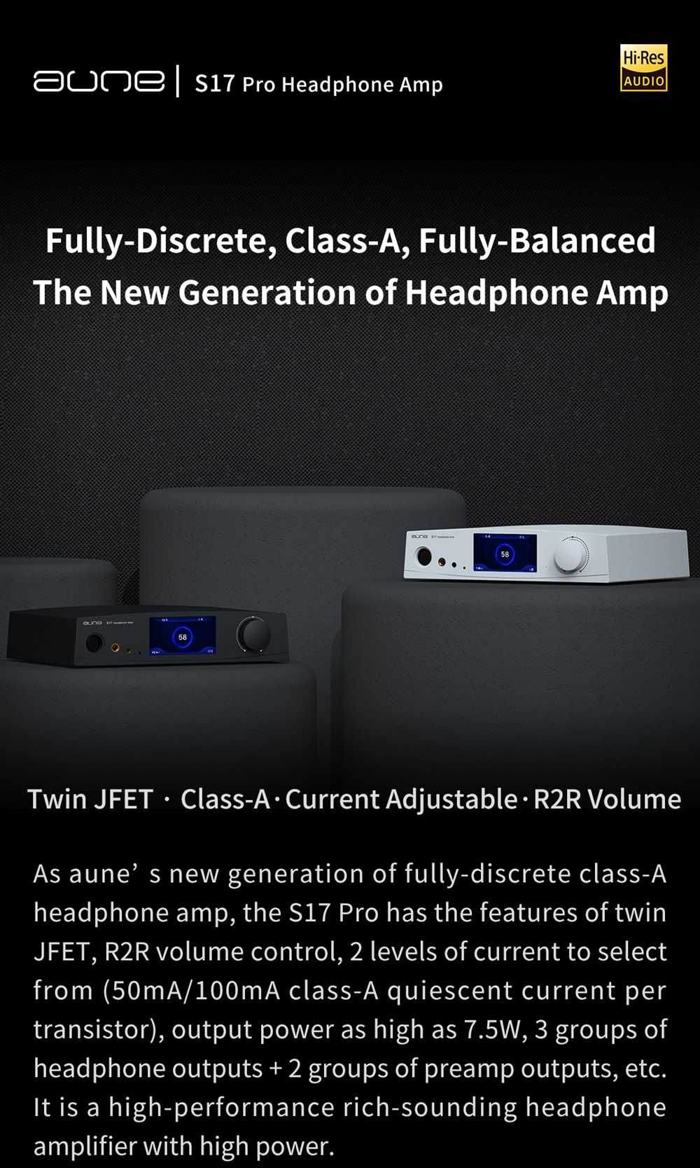 Aune S17 Pro EVO — это новое поколение полностью дискретных усилителей для наушников класса A от aune с двумя полевыми транзисторами JFET, регулятором громкости R2R, 2 выбираемыми уровнями тока (ток покоя класса A-L/A-H на транзистор), выходной мощностью до 7,5 Вт, 3 группами выходов для наушников + 2 группами выходов предусилителя и т. д. Это мощный усилитель для наушников с лучшим звуком и высокой производительностью.
