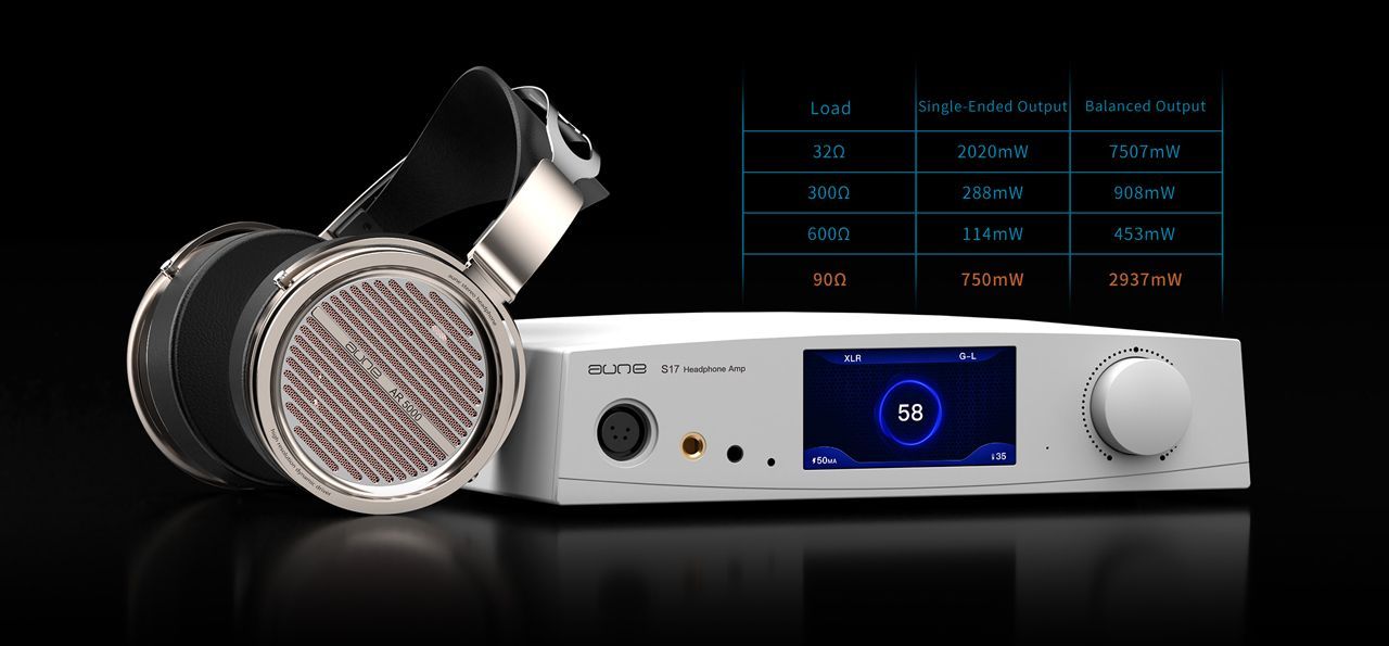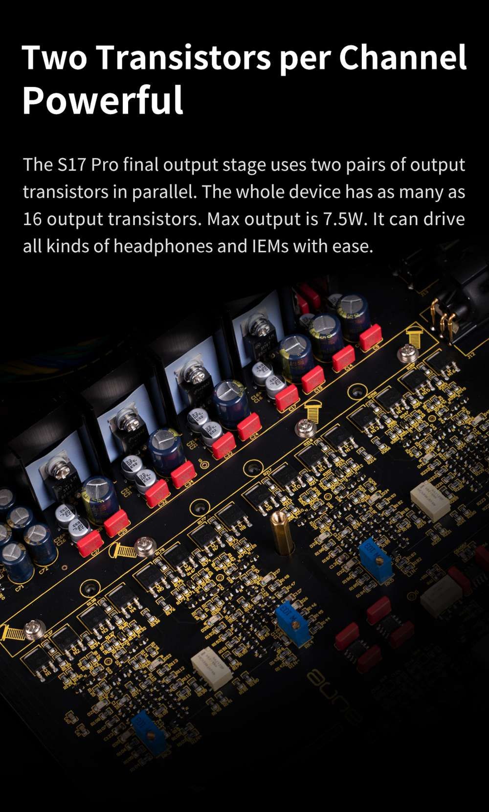 S17 Pro EVO работает с двумя парами выходных транзисторов, подключёнными параллельно. Всего в усилителе 16 выходных транзисторов. Максимальная выходная мощность составляет 7,5 Вт. Все типы наушников и внутриканальных наушников можно использовать без каких-либо проблем.