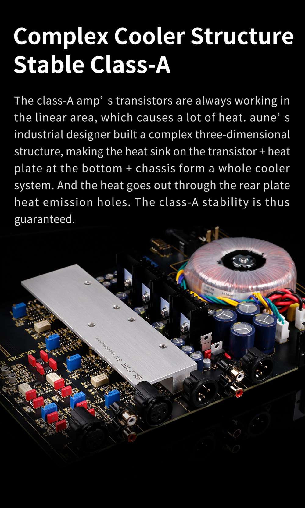 Транзисторы усилителя класса A всегда работают в линейном режиме, что приводит к выделению большого количества тепла. Промышленный дизайнер aune разработал сложную трёхмерную конструкцию, в которой радиатор на транзисторе, тепловая пластина снизу и корпус образуют единую систему охлаждения. Тепло рассеивается через отверстия для отвода тепла на задней панели. Таким образом, стабильность класса A гарантирована.