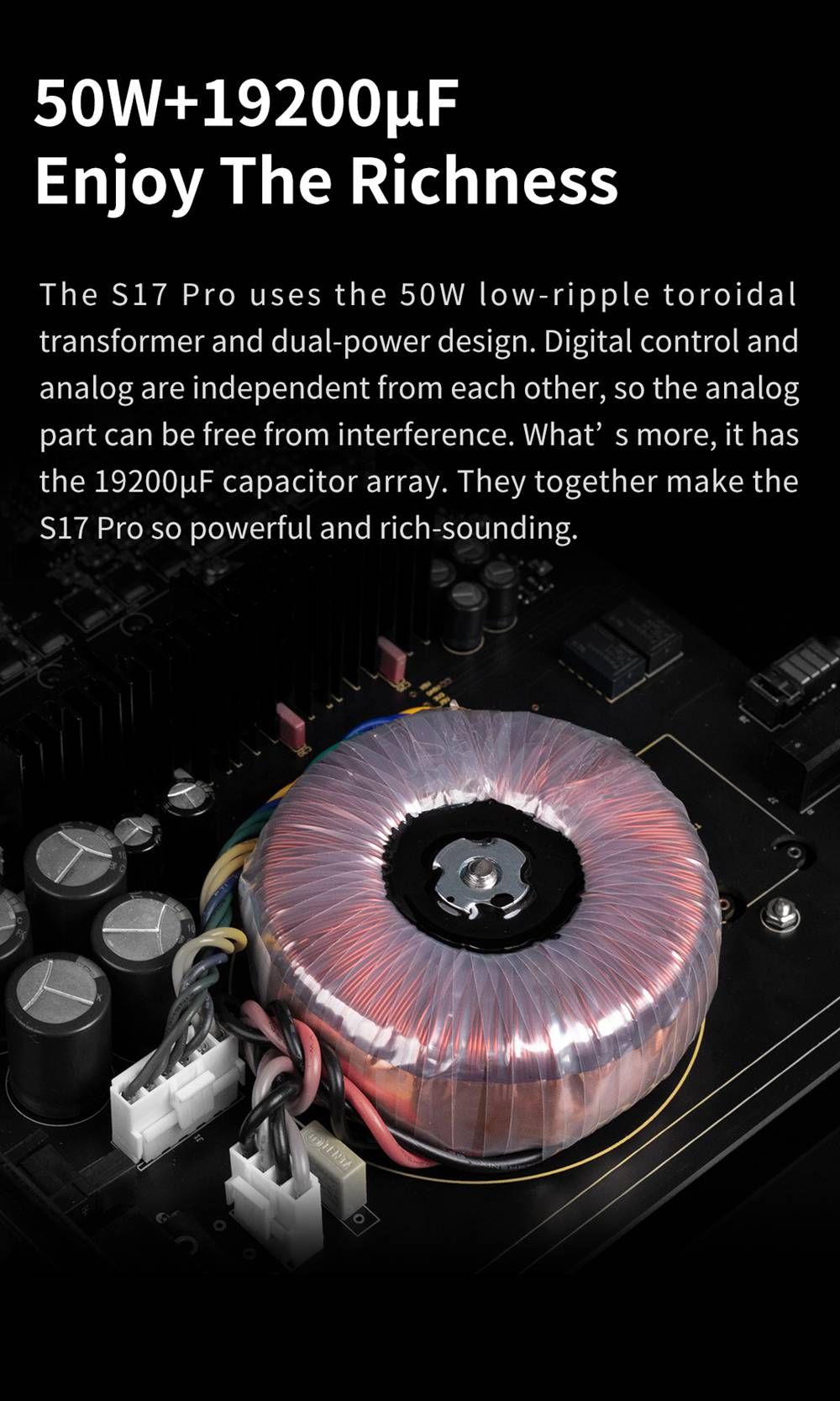 В S17 Pro Evo используется тороидальный трансформатор мощностью 50 Вт с низким уровнем пульсаций и двойной системой питания. Цифровое управление и аналоговый сигнал не зависят друг от друга, поэтому аналоговая часть не подвержена помехам. Кроме того, в нём используется конденсатор ёмкостью 19200 мкФ. Вместе они делают S17 Pro Evo таким мощным и звучным.