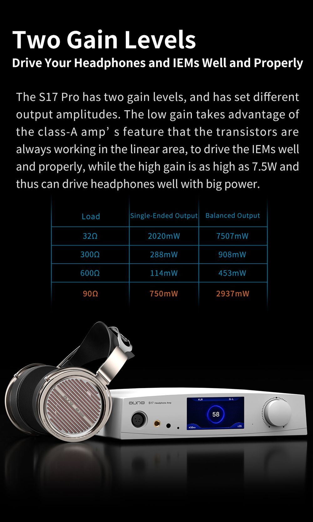 S17 Pro EVO имеет два режима усиления, каждый из которых обеспечивает разный уровень выходного сигнала. При низком усилении усилитель класса A поддерживает линейную работу транзисторов, чтобы хорошо и правильно воспроизводить звук в наушниках-вкладышах, а при высоком усилении мощность достигает 7,5 Вт, и усилитель может хорошо воспроизводить звук в наушниках высокой мощности.