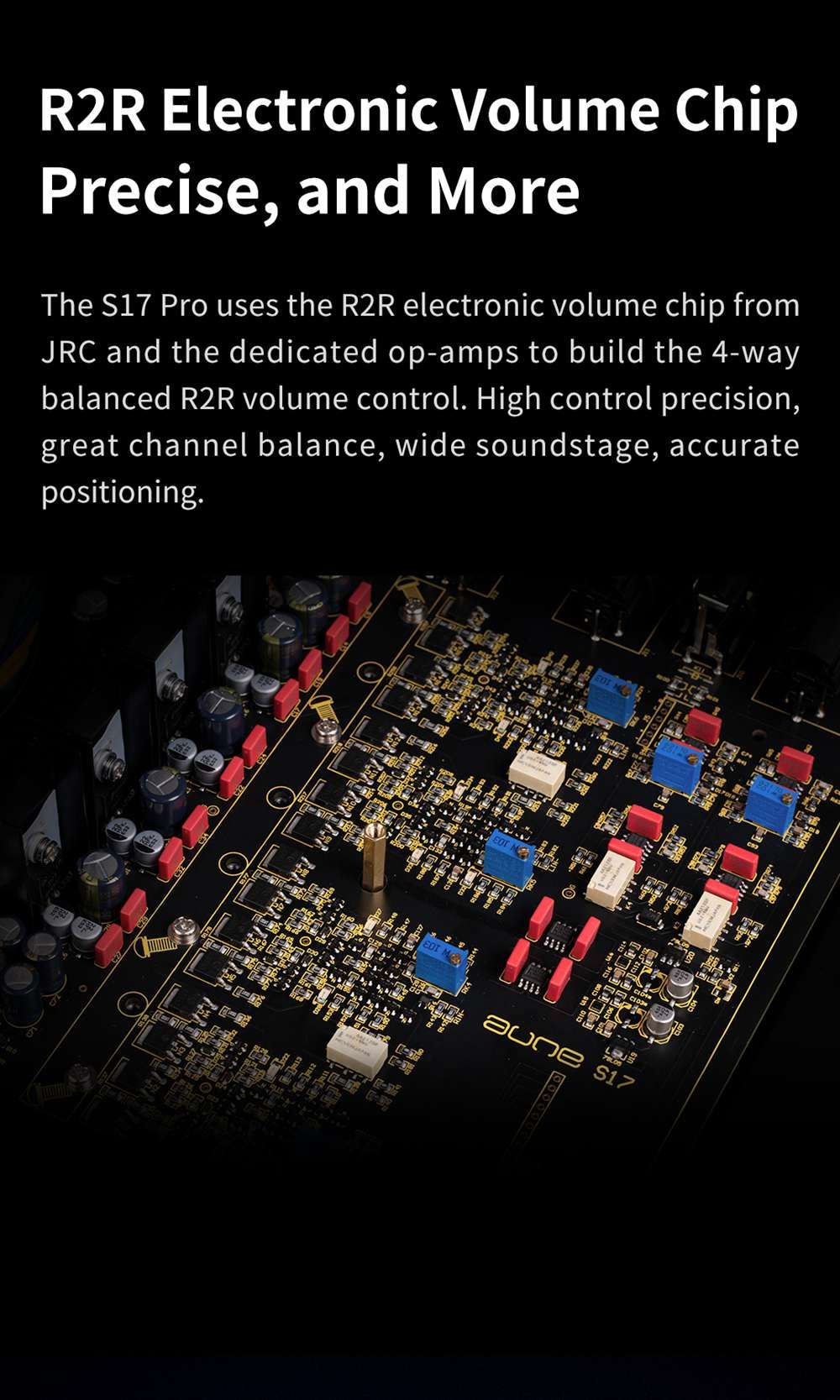 В S17 Pro Evo используется электронный регулятор громкости JRC R2R и связанные с ним операционные усилители для создания 4-позиционного сбалансированного регулятора громкости R2R. Высокая точность управления, отличный баланс каналов, широкая звуковая сцена, точное позиционирование.