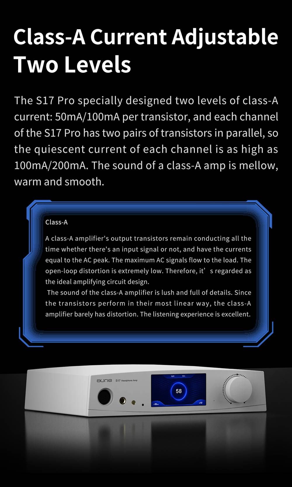 S17 Pro EVO был специально разработан для двухступенчатой регулировки тока класса A: каждый канал S17 Pro EVO имеет две пары транзисторов, соединённых параллельно, так что ток покоя на канал может достигать 100 мА/200 мА. Звук усилителя класса A мягкий, тёплый и плавный.