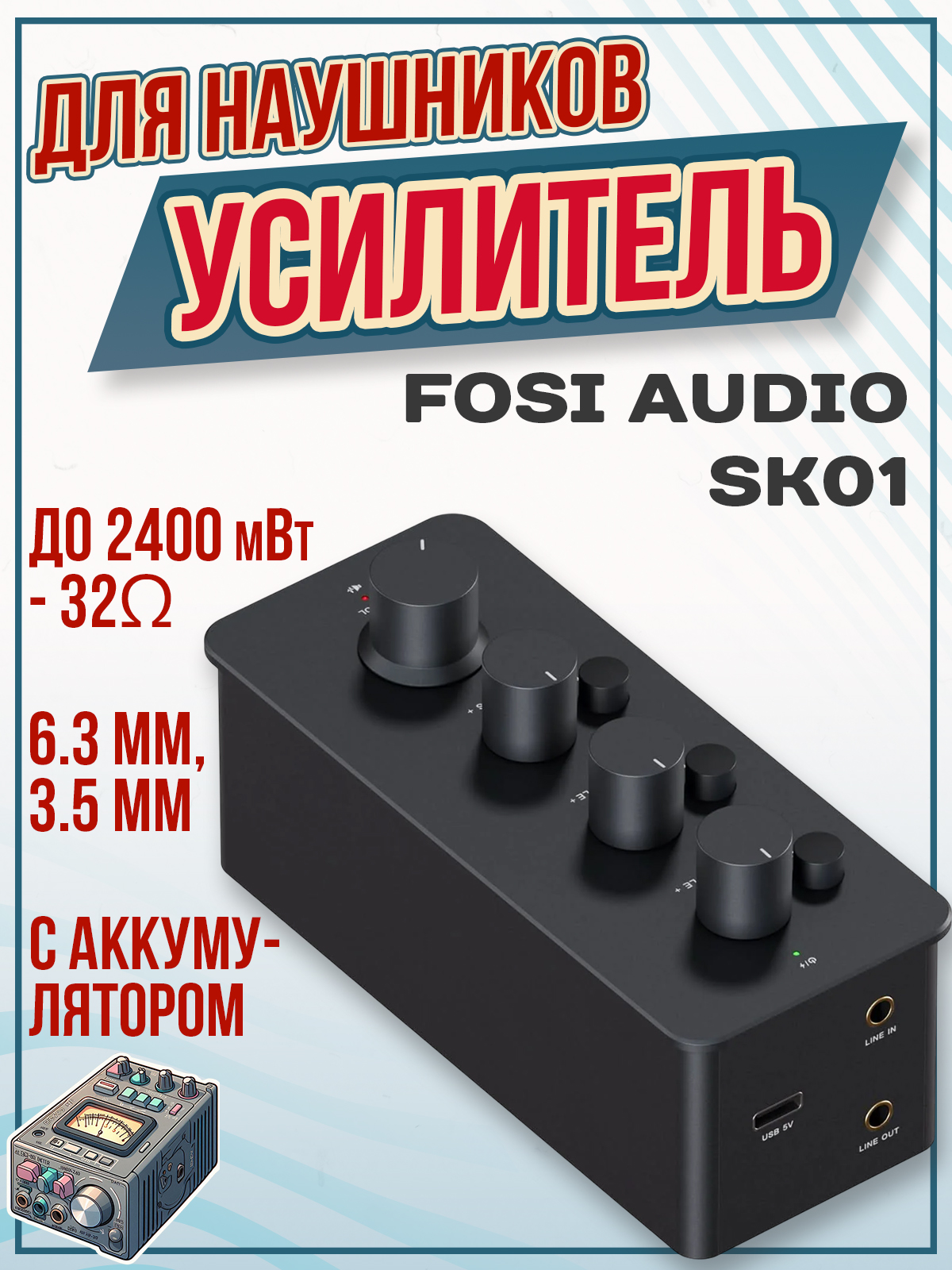 Широкая совместимость с наушниками: Усилитель для наушников 2 в 1 Fosi Audio SK01 обладает универсальными возможностями подключения. На входе имеется линейный 3,5 мм разъем, на выходе - линейный 3,5 мм разъем, а также разъем для наушников 3,5 мм/6,35 мм. Наслаждайтесь мощной работой благодаря максимальной выходной мощности RMS 2400 мВт@32Ω, рассчитанной на импеданс в диапазоне 16-300Ω. Повысьте качество звучания благодаря удобству подключения и исключительной мощности в одном компактном устройстве.