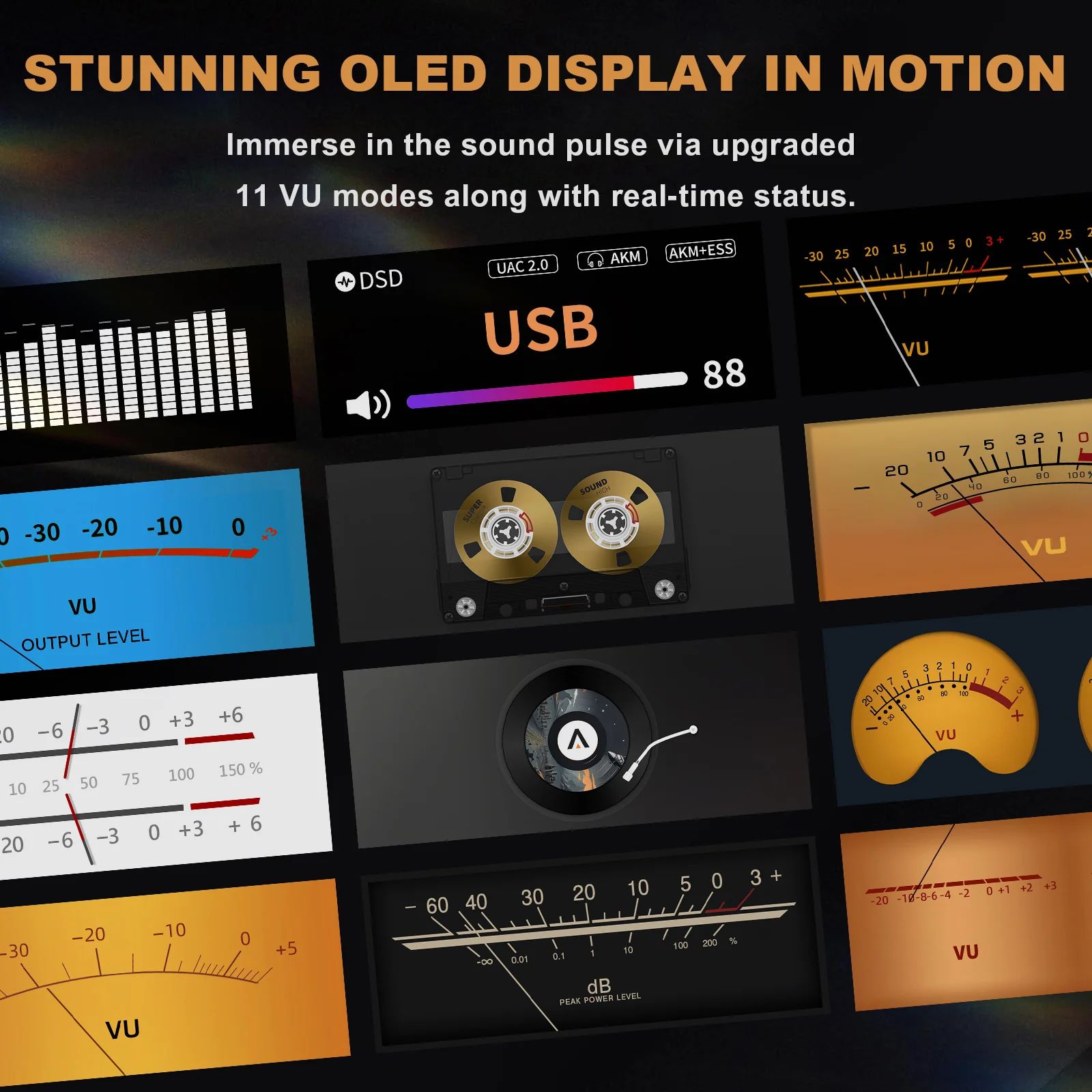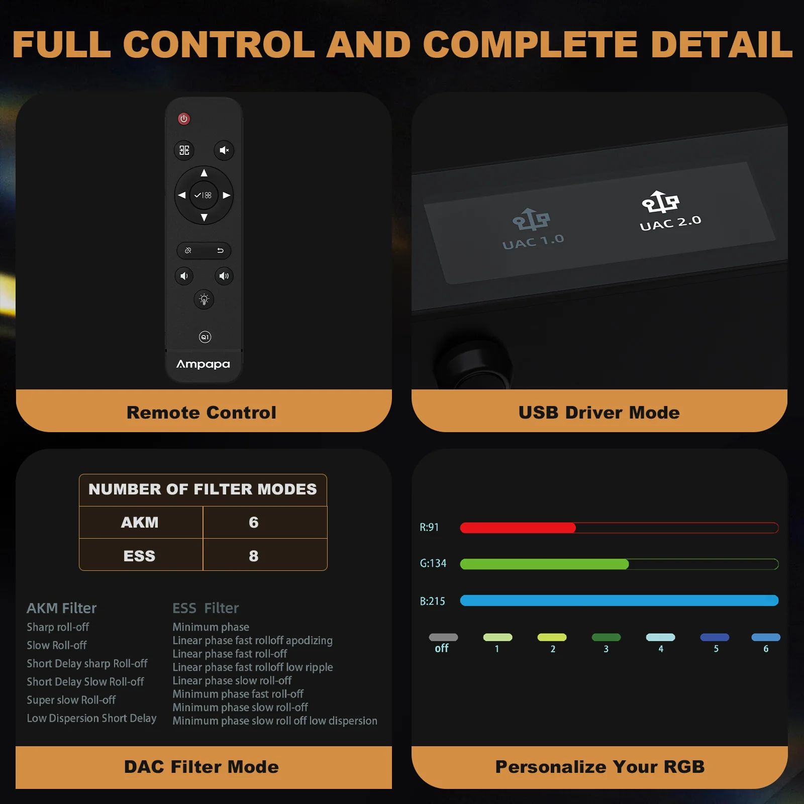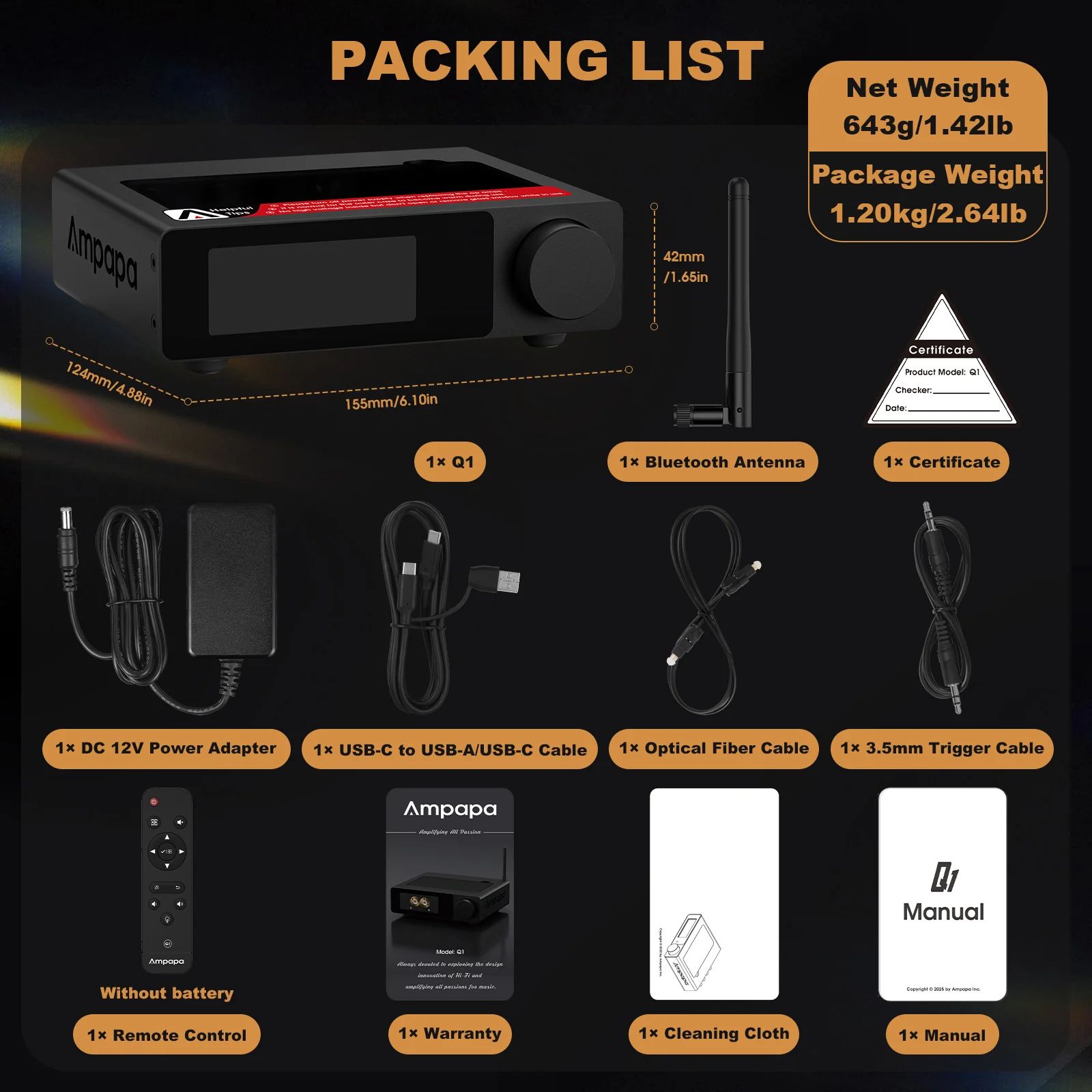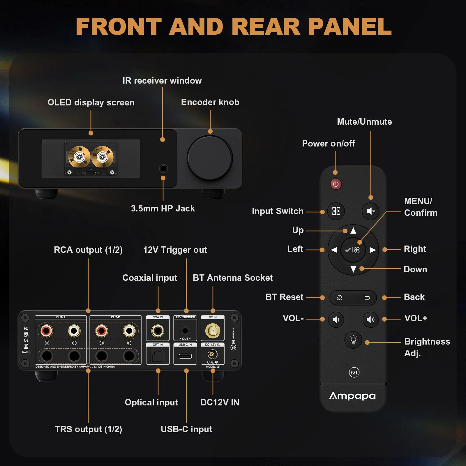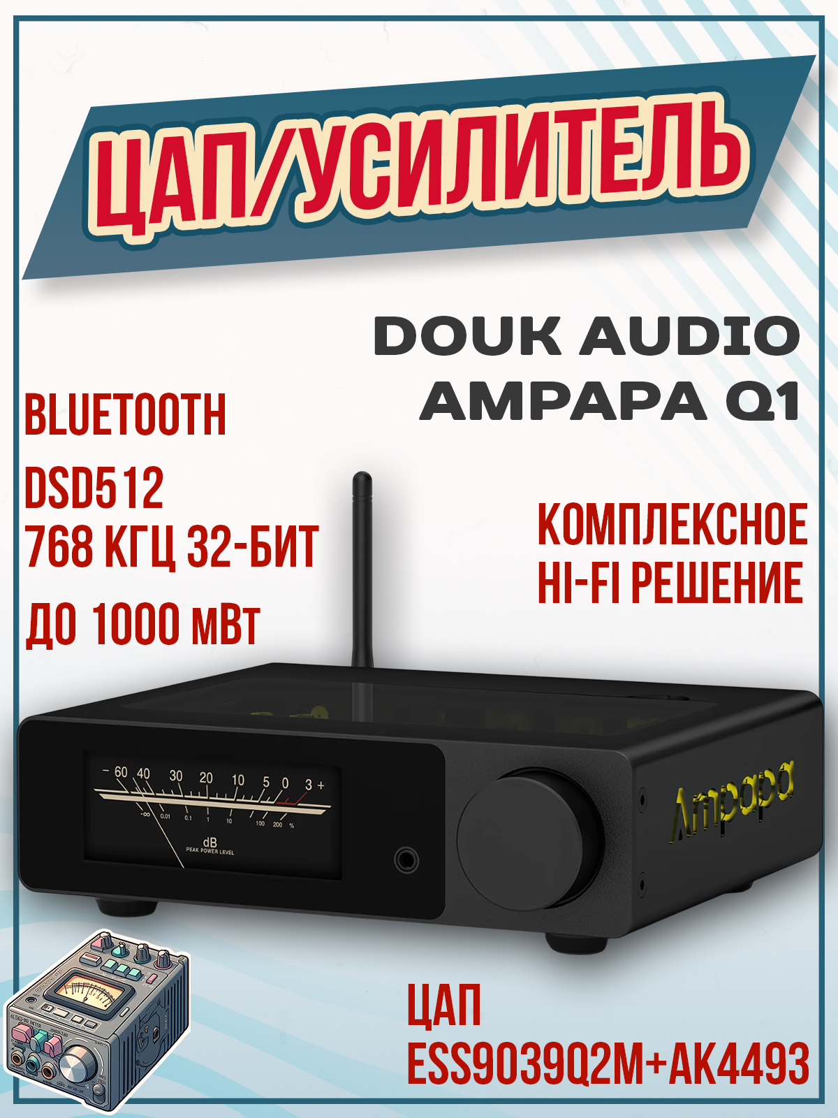 Douk Audio Ampapa Q1 — это усилитель для наушников и стереоусилитель с ЦАП (цифро-аналоговым преобразователем), оснащенный двумя чипами ЦАП (ESS9039Q2M+AK4493), который обеспечивает высокое качество звука с разрешением до PCM 768 кГц 32 бит и DSD512. Устройство имеет Bluetooth 5.2, поддерживает различные кодеки (SBC/AAC/aptX/aptX-HD), подключается через USB-C с поддержкой режимов UAC 1.0, 2.0 и оснащено ярким OLED-дисплеем с различными режимами отображения, такими как VU-метры, спектр и вращающийся винил.