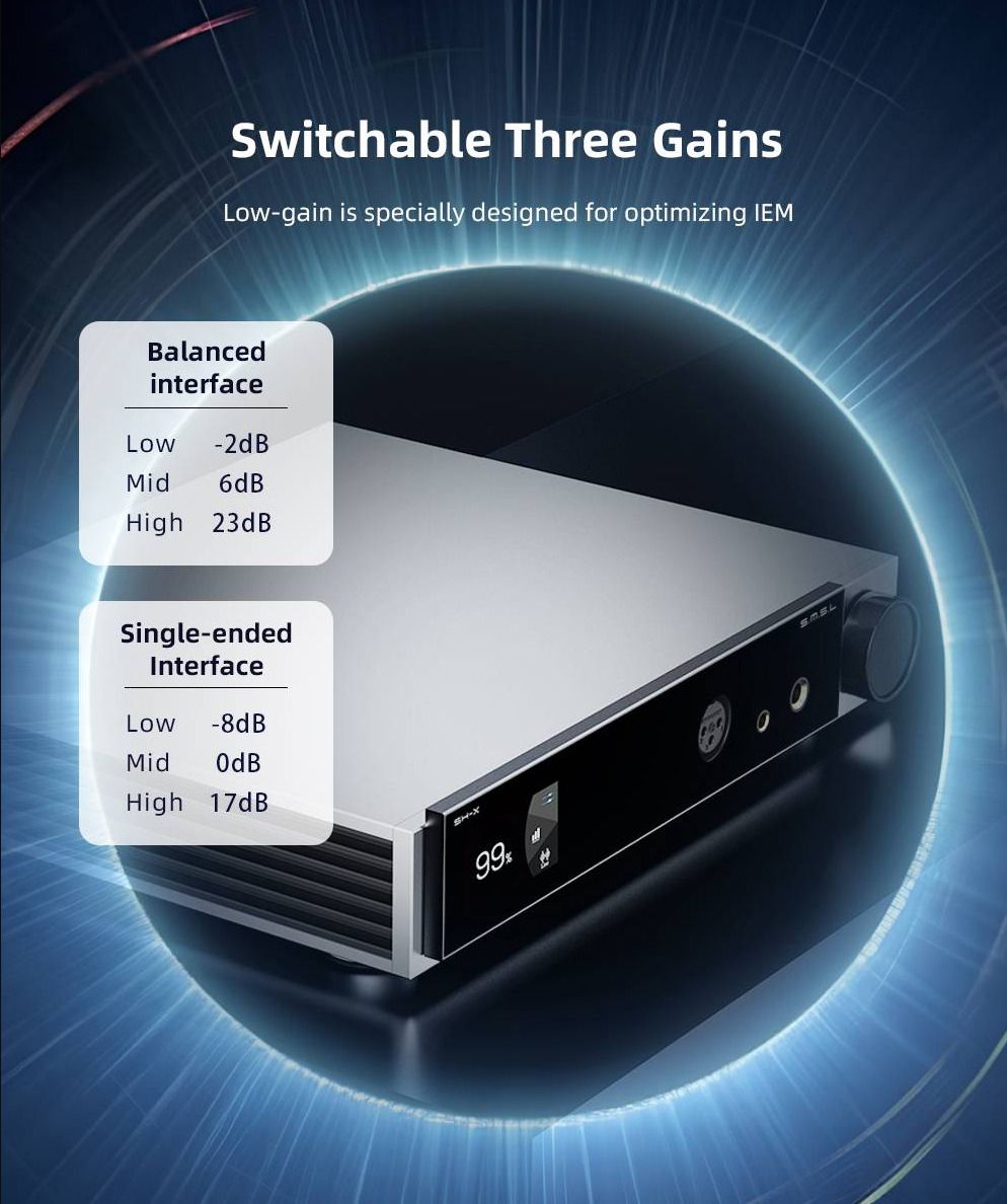 Настройте свои ощущения от прослушивания с помощью трехпозиционного переключателя усиления. Режим низкого усиления идеально подходит для любителей IEM, обеспечивая оптимальную производительность без перегрузки низкоомных наушников.