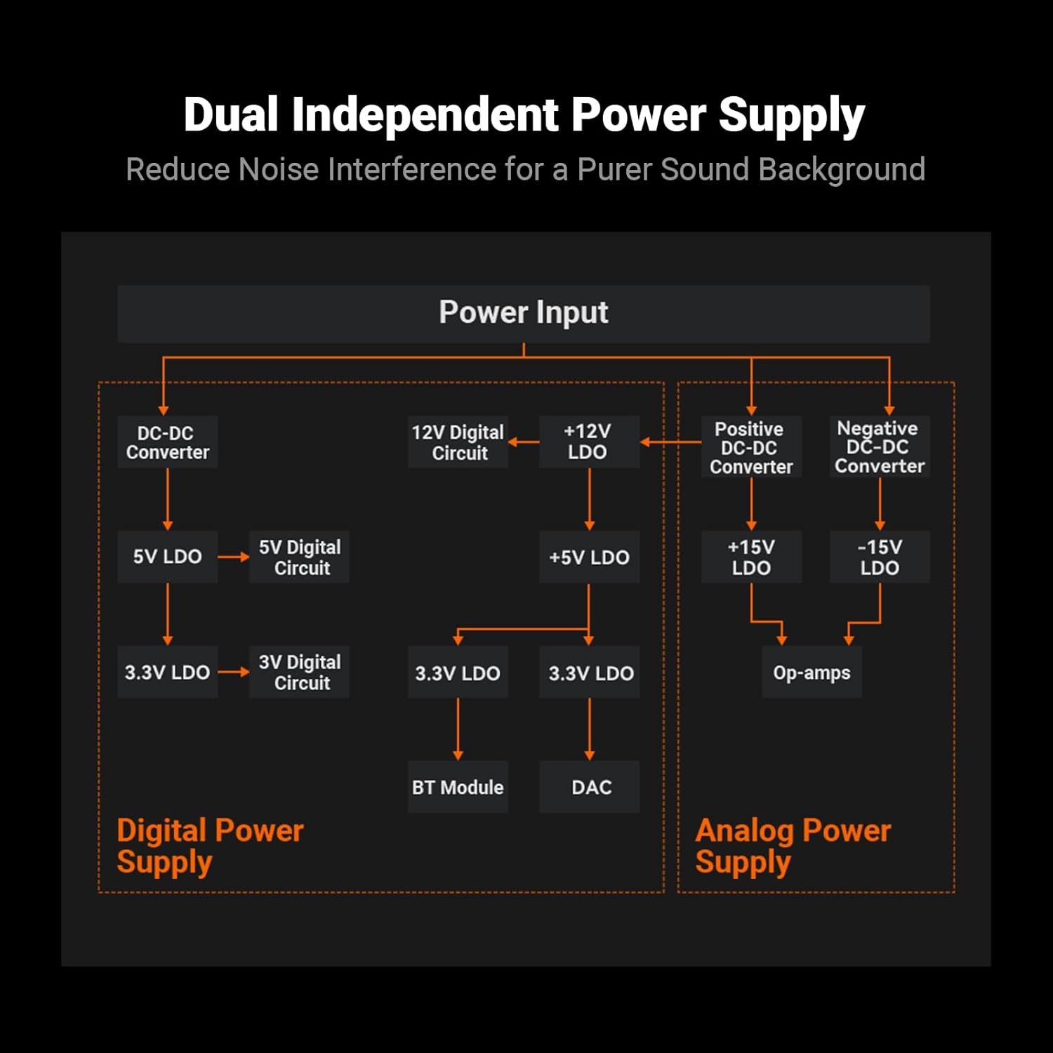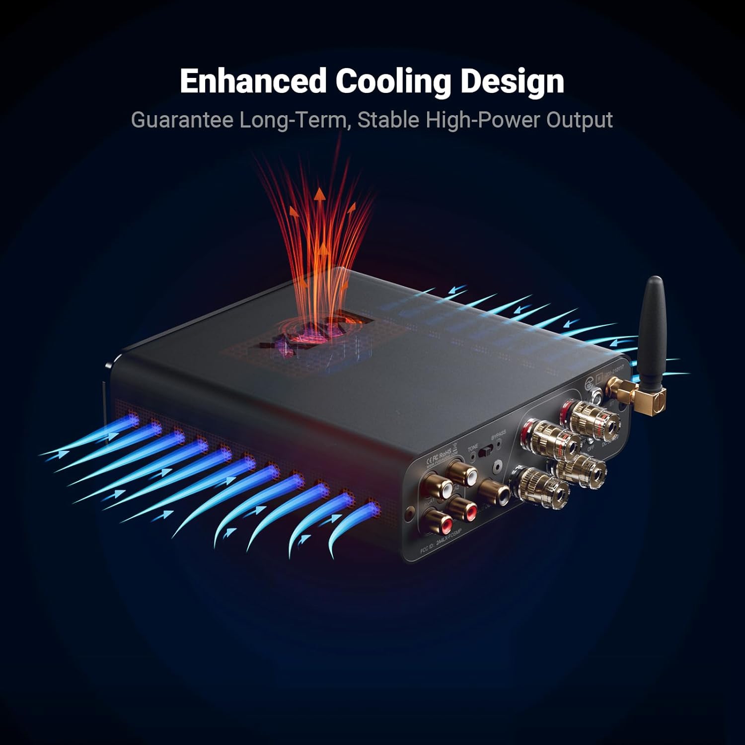 Усилитель оснащён Bluetooth 6.0 на базе чипа Qualcomm QCC3095 с поддержкой кодеков SBC, AAC, aptX, aptX HD, aptX Adaptive, aptX Lossless и LDAC. Беспроводное соединение рассчитано на расстояние до 15 метров. Предусмотрены два аналоговых входа RCA и отдельный выход на активный сабвуфер, что позволяет собрать систему 2.1 без дополнительных устройств. Управление входами и уровнем громкости возможно как с фронтальной панели, так и с комплектного ИК-пульта.