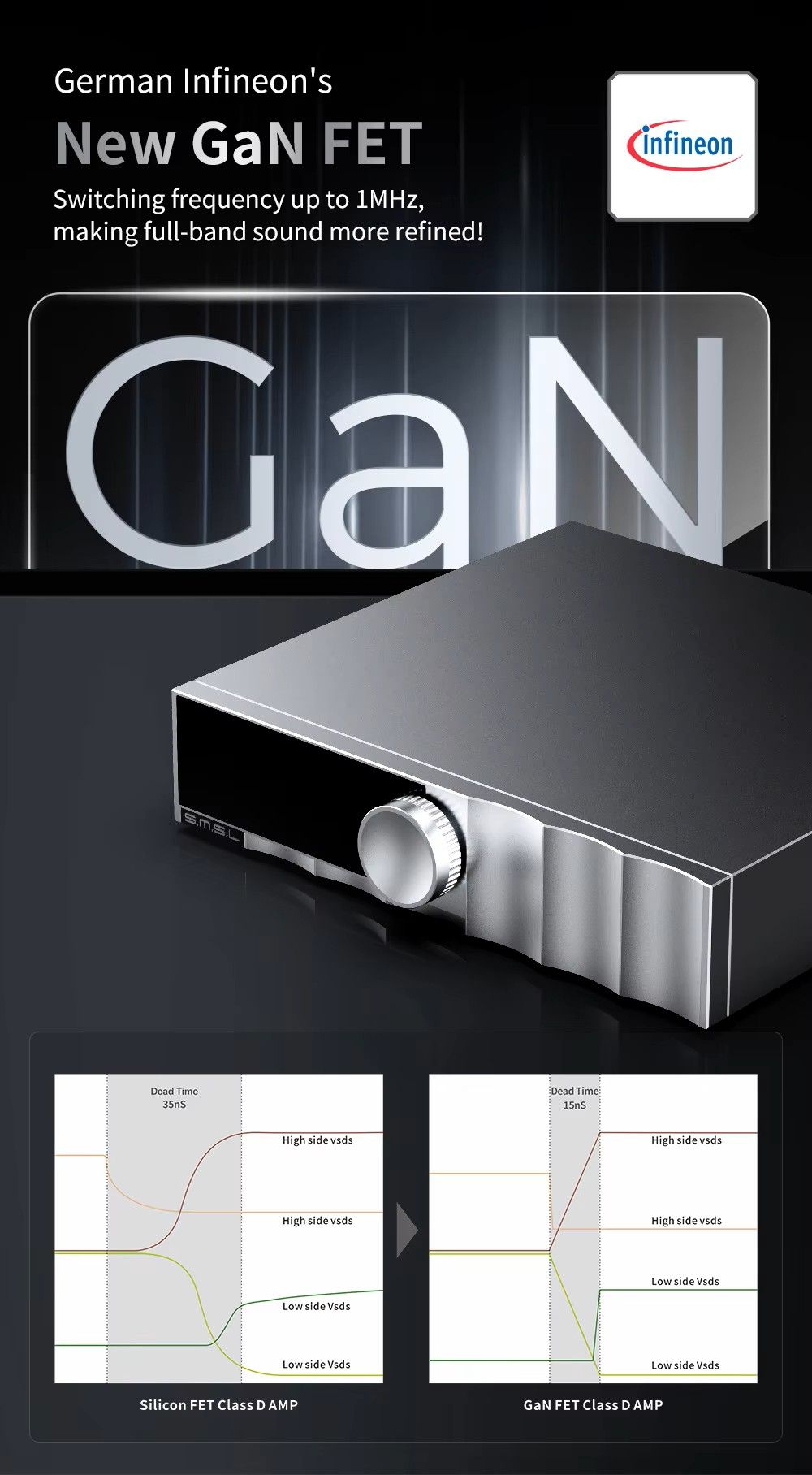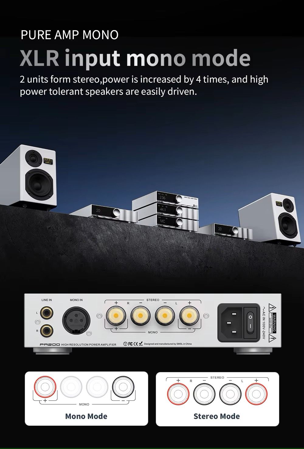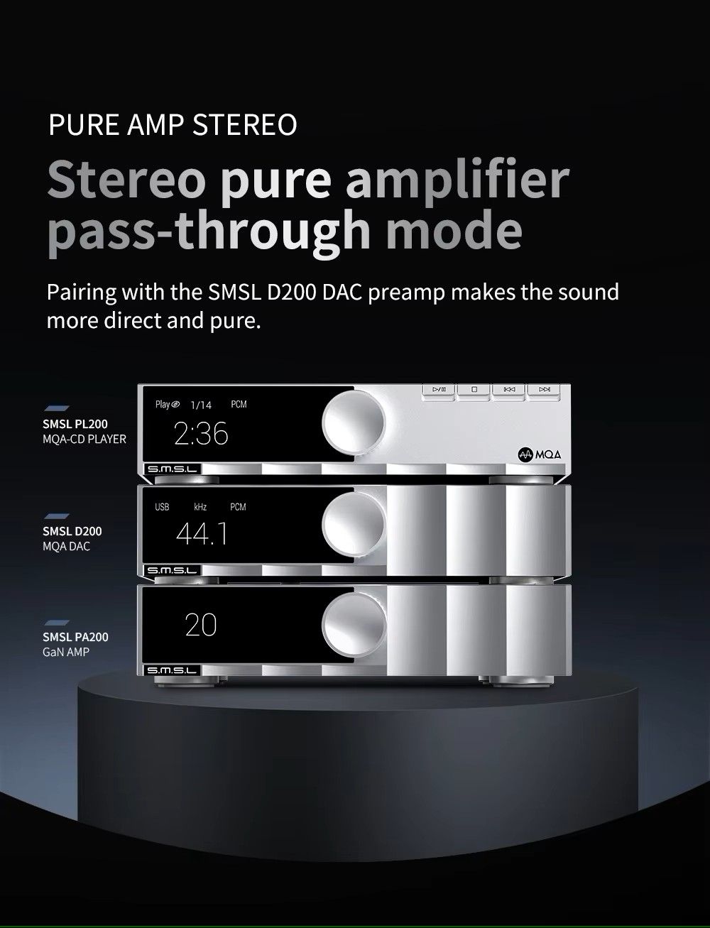 Бренд SMSL представил усилитель мощности PA200, наделенного некоторыми чертами интегрального усилителя. Он оснащён возможностью регулировки громкости и работы в мостовом режиме, выступая в качестве моноблочного усилителя мощности. Выходные каскады новинки используют высокопроизводительные транзисторы Infineon GaN FET, обеспечивая мощность до 160 Вт на каждый из двух каналов при работе на нагрузку номинальным сопротивлением 4 Ом или до 400 Вт на 4 Ом в мостовом режиме. Гармонические искажения при этом остаются на уровне всего 0,003%.
